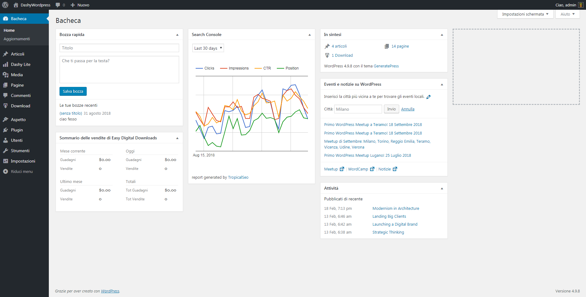 This plugin displays your Search Console analytics data in the WordPress dashboard and adds the verification code of Google Search Console, to your site. You can see Clicks, Positions, CTR, and Impressions.