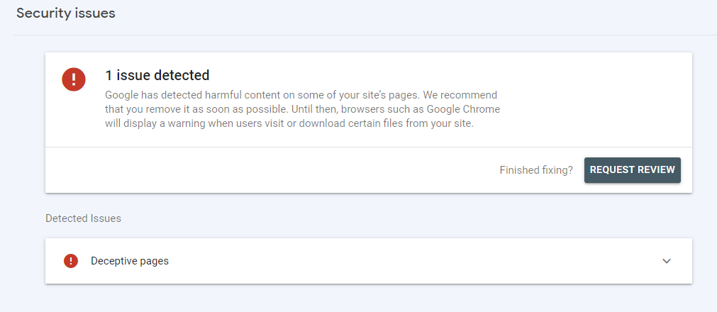 Google has detected harmful content on some of your site’s pages. We recommend that you remove it as soon as possible. Until then, browsers such as Google Chrome will display a warning when users visit or download certain files from your site.